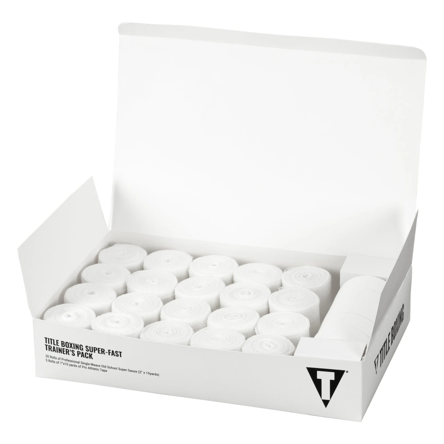 We came up with the Super-Fast Trainers Pack that includes the right combination of tape and gauze to make it easy always to be prepared. The package contains 20 Rolls of professional, single-weave old-school super gauze (2” x 15 yards) and 5 Rolls of pro athletic tape (1” x 10 yards). The Gauze and Tape meet all amateur and professional athletic regulations.